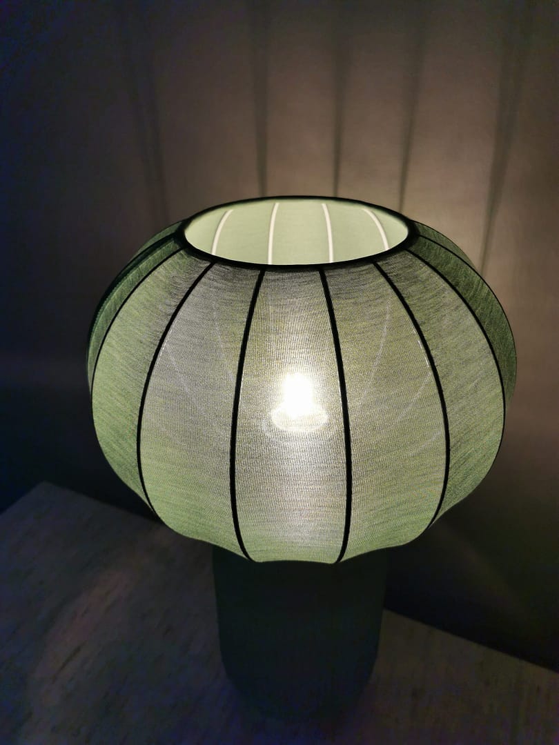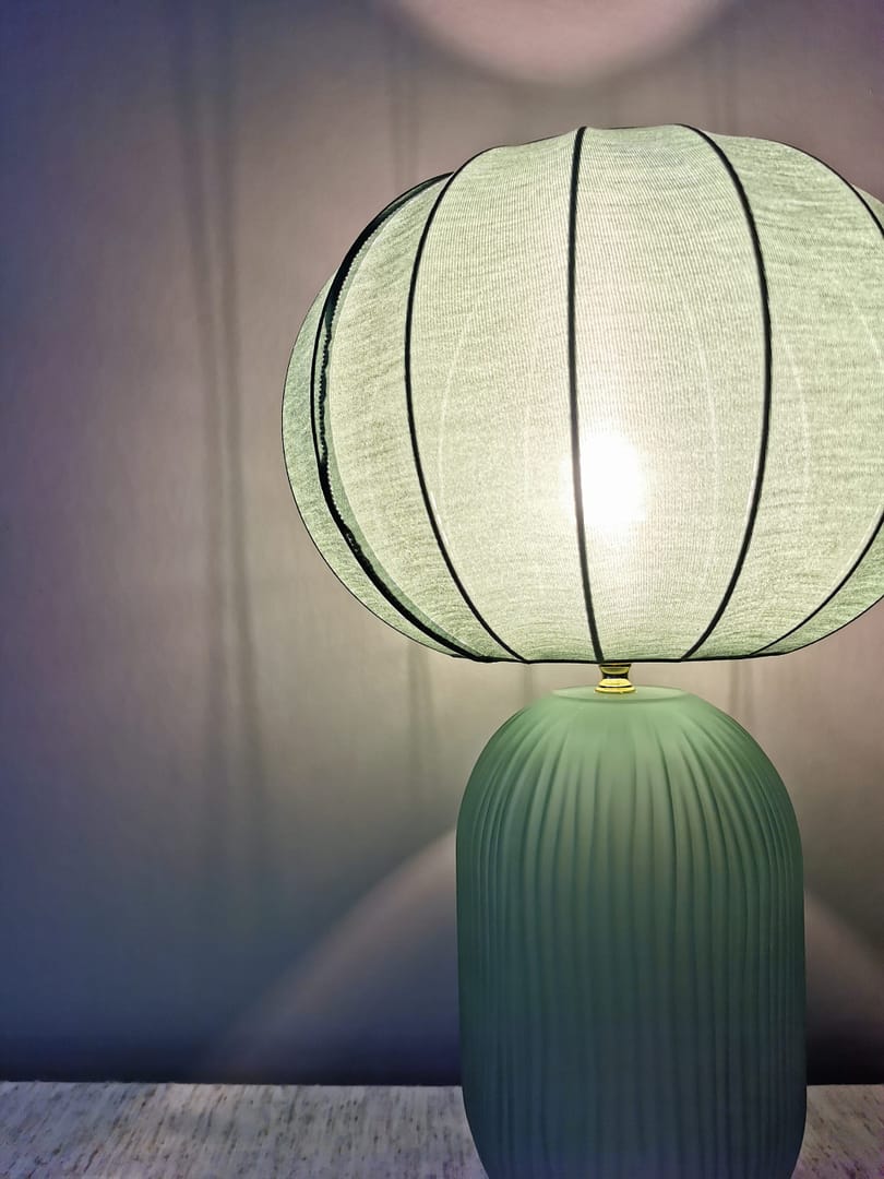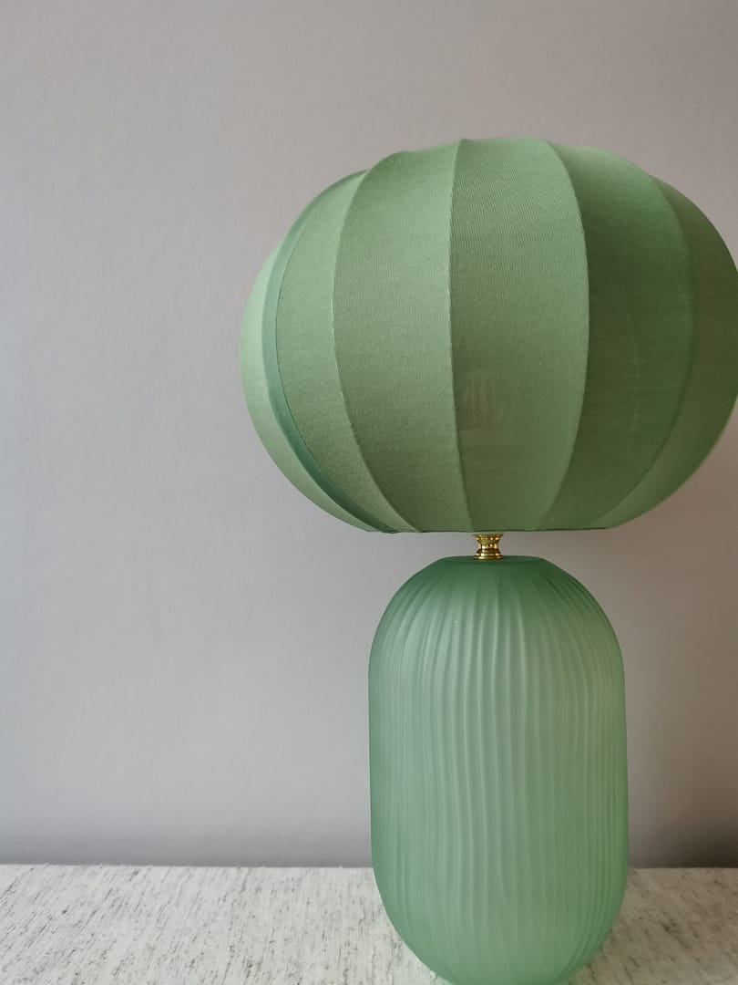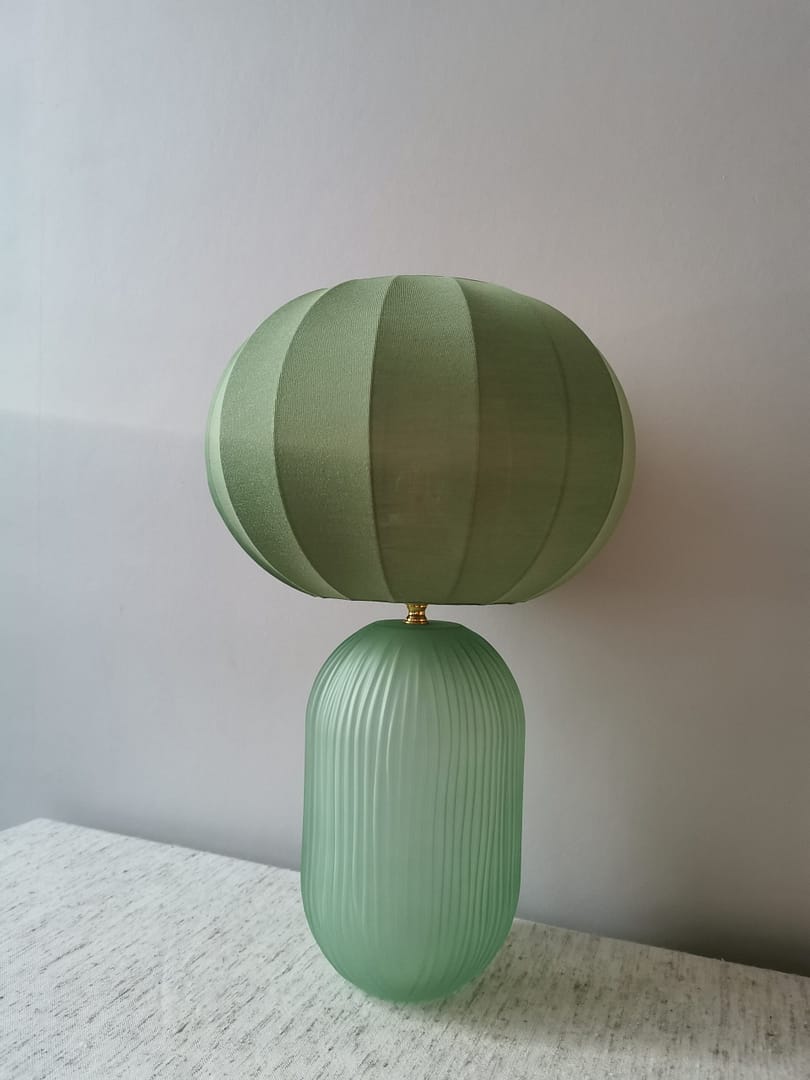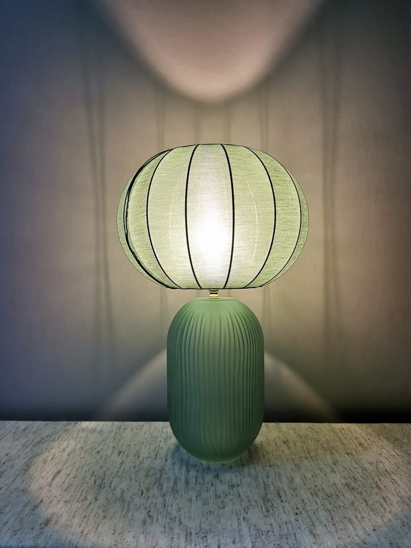 Mots clés: Lampe en verre, Lampe avec abat-jour en toile chinée, Luminaire artisanal design, Éclairage naturel et chaleureux, Décoration intérieure tendance, Lampe éco-responsable, Ambiance cosy et élégante.